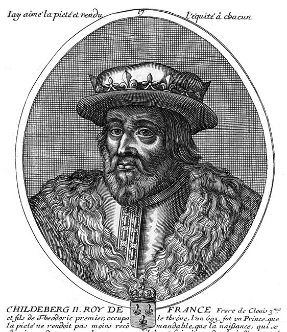 CHILDEBERG II ROY DE FRANCE. Frère de Clovis 3ème et fils de Théodoric premier, occupa le trône, l'an 693. Fut un Prince, que la piété ne rendait pas moins recommandable, que la naissance, qui se fit aimer de ses peuples, parce qu’il leur faisait rendre la justice, et qui ne tiendrait pas le sixième lieu dans les fainéants, s'il eut eu la vigueur nécessaire, au gouvernement de l'Etat, mais ne s'étant point mis en devoir de ravaler le crédit de Pépin, surnommé le Gros, ayant souffert que Grimoald fils aîné de ce Maire occupa la place du père, que son puîné fut établi au Gouvernement de Bourgogne, et que Charles Martel son bâtard, fut assuré d'Austrasie. Il emporta dans le tombeau cette odieuse qualité, après avoir été sur le trône 17 ans et quelques mois, il laissa deux enfants, qui ne relevèrent point ses défauts, le premier fut Dagobert second du nom sous le Pontificat de Constantin. et l’Empire d'Anabase second, dit Athénius A Paris chez Boissevin à la rue St Jacques proche la fontaine St Séverin.