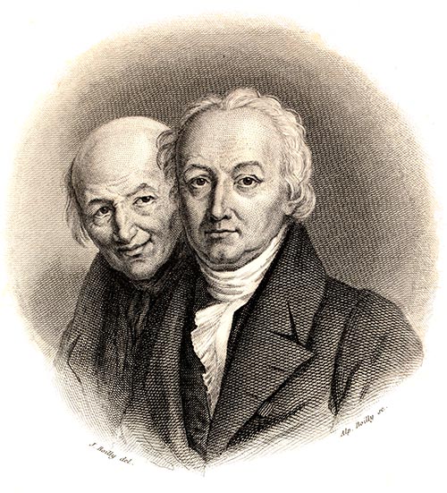 Les deux fils d’un pauvre paysan de la Picardie, les deux frères Haüy, dans des carrières différentes, ont pris rang parmi les hommes les plus utiles de la génération qui nous a précédés. Si l’illustration de l’aîné, du créateur de la Cristallographie, du vénérable et irréprochable Haüy (René Just), a été plus brillante que celle de son frère Valentin, on reconnaîtra sans doute que ce dernier, pour avoir fait en faveur des Aveugles autant que l’abbé de l’Épée pour les Sourds-Muets devait obtenir, en raison de la spécialité de notre recueil, la première place dans le groupe où sont reproduits les traits de ces deux Amis de l'humanité, Haüy( René Just) naquit, le 28 février 1743, au village de Saint-Just, dans le département de l’Oise. Fils d’un pauvre tisserand, il aurait probablement embrassé la profession de son père, si des personnes généreuses qui avaient remarqué en lui des dispositions à s’instruire n’eussent pris soin de son éducation. Il y avait alors à Saint-Just une abbaye : Haüy, encore enfant, suivait assidûment les cérémonies religieuses et montrait beaucoup de goût pour les chants d’église. Il attira l’attention du prieur qui le fit venir, l’interrogea et, frappé du développement de son intelligence, lui fit donner des leçons par quelques religieux. Les progrès du jeune Haüy furent si rapides que ses maîtres engagèrent sa mère à le conduire à Paris, où ils présumaient qu’il trouverait facilement les moyens de continuer ses études. Cette mère courageuse suivit ce conseil, et sans se rebuter des obstacles, sans s’épouvanter d’un voyage dans une grande ville où elle se trouverait sans ressources, elle partit avec son fils pour lequel, après une longue attente, elle obtint une place d’enfant de chœur. Plus tard, il fut admis comme boursier dans le collège de Navarre. Là, sous des professeurs habiles, il parvint assez promptement au plus haut degré de savoir exigé pour des études régulières et complètes. Quoique très jeune encore, il reçut de ses supérieurs la mission d’enseigner ce qu’ils lui avaient appris. A vingt-et-un ans, il fut régent de quatrième et bientôt après il devint régent de seconde au collège du cardinal Lemoine. Son goût pour les sciences naturelles ne tarda pas à se développer ; et aussitôt qu’il eut prit les ordres sacrés, il s’appliqua d’abord à la botanique. Son premier maître, dans cette science, fut son ami, le vénérable Lhomond, l’auteur du Rudiment, plus connu comme grammairien que, comme botaniste. Le collège du cardinal Lemoine était près du Jardin des Plantes : Haüy allait souvent visiter ce précieux dépôt de toutes les richesses végétales. Un jour voyant la foule des auditeurs qui se pressaient pour assister à une leçon de Daubenton sur la minéralogie, il voulut entendre ce professeur et fut charmé de trouver dans cette branche des sciences naturelles, des sujets d’études qui se rattachaient encore plus directement que les produits de la végétation à son goût pour la physique. La comparaison des plantes et des minéraux fit naître dans son esprit une suite de réflexions qui préparèrent ses découvertes en Cristallographie. Plein de ces idées, il examinait quelques minéraux chez un de ses amis, M. de France, maître des requêtes, lorsqu’il laissa tomber un beau groupe de spath calcaire cristallisé en prismes ; quelques fragments détachés du groupe se présentèrent sous l’apparence d’un cristal nouveau d’une forme régulière, lisse sur toutes les faces. Haüy aperçoit avec surprise que cette forme est précisément celle des cristaux rhomboïdes du spath d’Islande, «Tout est trouvé !» s’écria-t-il aussitôt dans l’enthousiasme de sa découverte. Daubenton et Laplace l’encouragèrent à en faire part à l’Académie des sciences ; mais Haüy était trop modeste pour se décider tout-à-coup à paraître sur un si grand théâtre ; il ne céda qu’à des sollicitations réitérées, et la première fois qu’il se rendit au Louvre, où l’illustre compagnie tenait ses séances, il s’y montra comme dans une cérémonie ecclésiastique, revêtu du costume prescrit par les canons. Sa théorie, qu’il exposa avec une lucidité remarquable, lit une profonde sensation. L’importance de ses travaux fut justement appréciée, et l’Académie s’empressa de l’admettre dans son sein. Haüy s’occupa sans relâche de rassembler tous les faits de la science dont il était le créateur. Sa seule ambition était de ne pas la laisser imparfaite ; et tout entier au but qu’il poursuivait, il restait étranger à tout ce qui n’était pas de la cristallographie. Ce fut dans cet isolement que les évènements de la Révolution le surprirent. Déjà la Bastille était tombée, et la monarchie était sur le penchant de l’abîme qui allait l’engloutir, lorsqu’on fit à l’abbé Haüy l’injonction de prêter serment à la constitution civile du clergé. Haüy, sans trop savoir ce qu’on exigeait de lui, refusa, parce que, dans le monde où il vivait, il entendait dire que sa conscience l’obligeait à ce refus. Il fut alors privé de tous ses emplois, et bientôt après il fut incarcéré dans le séminaire de Saint-Firmin converti en prison. Quand on se présenta pour l’arrêter, on lui demanda s’il n’avait point d’armes à feu. « Je n’en ai point d’autres que celles-ci » dit-il, en tirant une étincelle de sa machine électrique. On saisit ses papiers où il n’y avait que des calculs mathématiques ; on culbuta sa collection qui était sa seule propriété. Haüy ne parut pas soupçonner un seul instant le danger de sa position. A peine installé dans son habitation nouvelle, il ne songea qu’à se faire apporter ses tiroirs, afin de mettre ses cristaux en ordre. Heureusement il avait des amis au dehors. Un de ses élèves, devenu depuis son collè